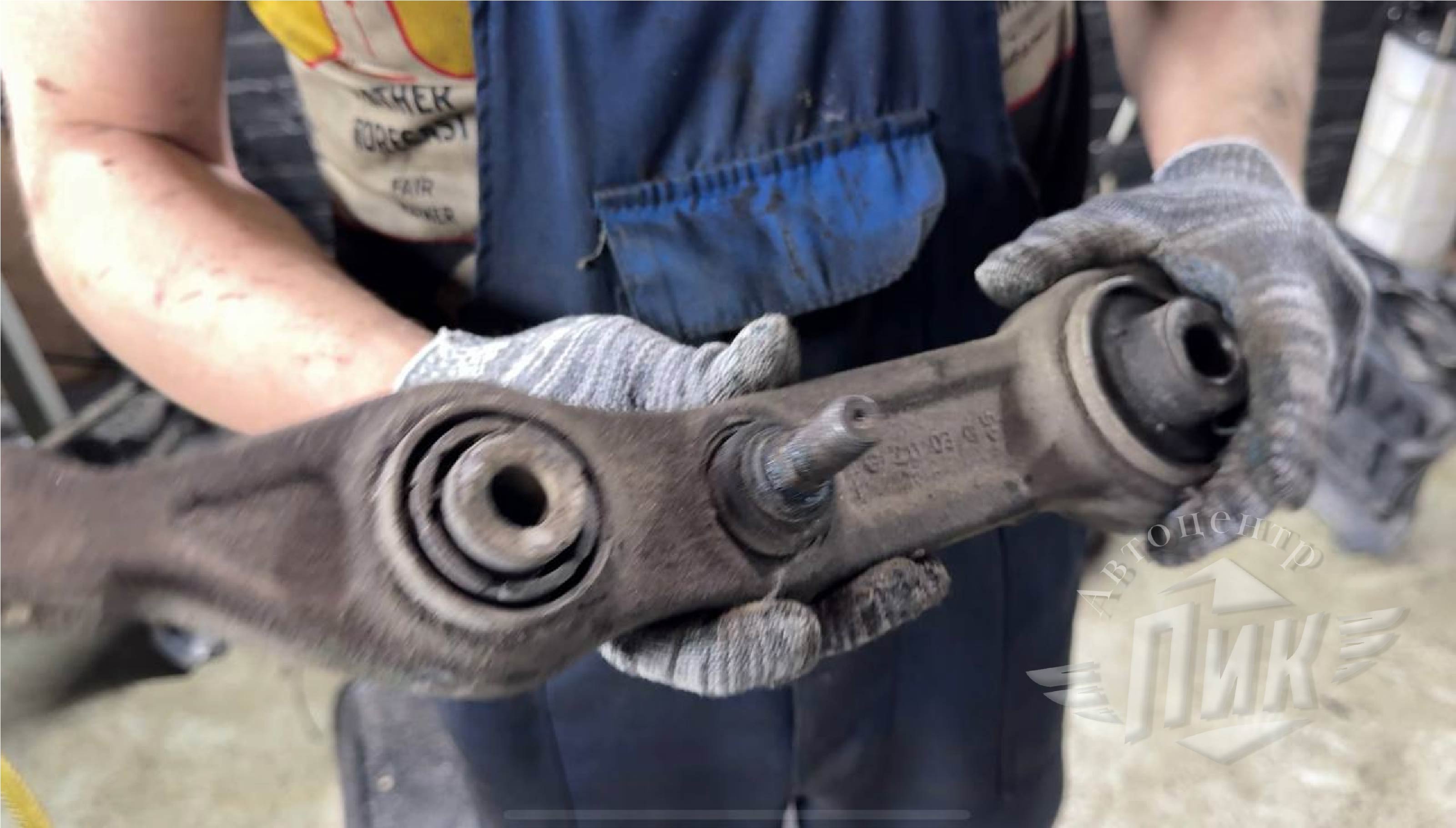 К нам в автосервис ПИК в Москве приехал клиент на автомобиле Mercedes-Benz E-Class в кузове W211. Авто 2007 года выпуска с пробегом в 300 000 км. Машина попала в аварию (врезалась в бордюр), в результате деформировался нижний рычаг передней подвески. Было решено его заменить. По согласованию с клиентом, заменили и второй рычаг передней подвески, так как он уже пришёл в негодность.